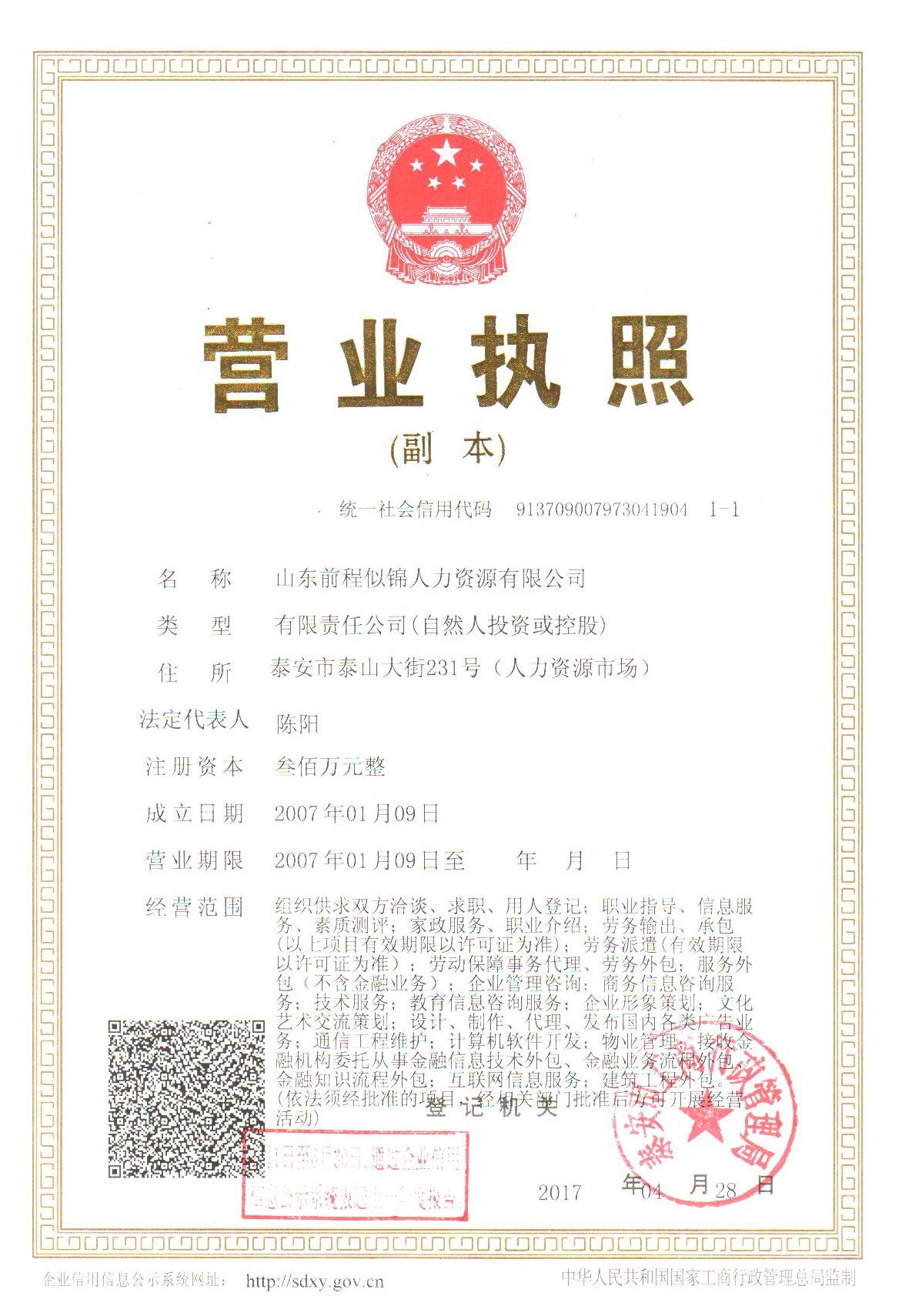 山東前程似錦人力資源有限公司成立于2007年1月,注冊資本1000萬元,公司注冊地為泰安市風景名勝區,目前已在濟南市等16個地市設有分公司(辦事處),在北京、上海、天津等地設有駐在機構。